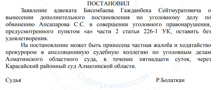 On February 9, 2023, the judge of the Karasay District Court, Ralat Bolatkan, handed down three suspended years to the raider Serik Apsaparov. Meanwhile, on February 21, a petition was received from Bolat Nazarbayev’s representative, Gajdanbek Bisembayev, for the return of his money.