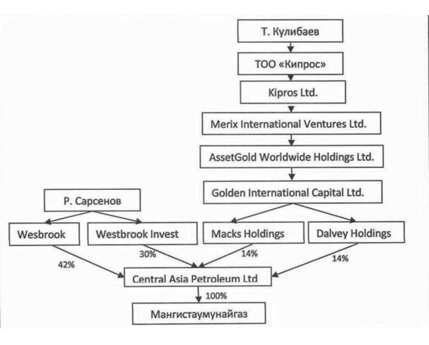 In an open letter to the President of Kazakhstan, Ablyazov outlined a scheme in which Nazarbayev’s son-in-law allegedly acquired MangystauMunayGas. According to his claim, in 2008, Kulibayev pressured Sarsenov to transfer shares of the oil and gas company to him free of charge, and subsequently concealed the transaction from government authorities.