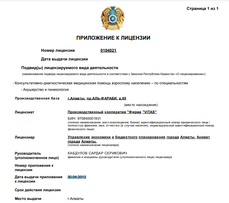 Back in March 2010, the organization was allowed to provide medical care in the speciality of obstetrics and gynaecology. The license application was issued on April 30, 2013. The document is still valid.