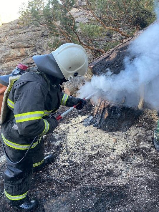 Over 20 units of regional emergency equipment, more than 60 personnel, firefighting volunteers, forestry workers, and a special firefighting train have been deployed. A helicopter has also surveyed the area.