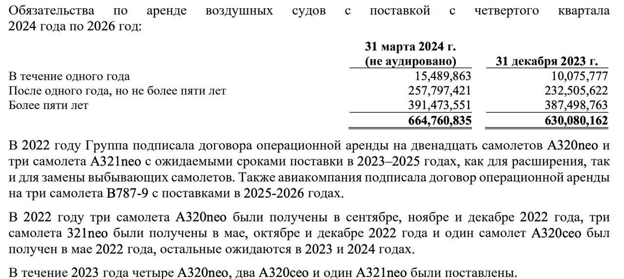 In total, the company has around ₸665 billion in future lease obligations for aircraft to be delivered (some already received) in 2024–2026 — most of it extending beyond five years.