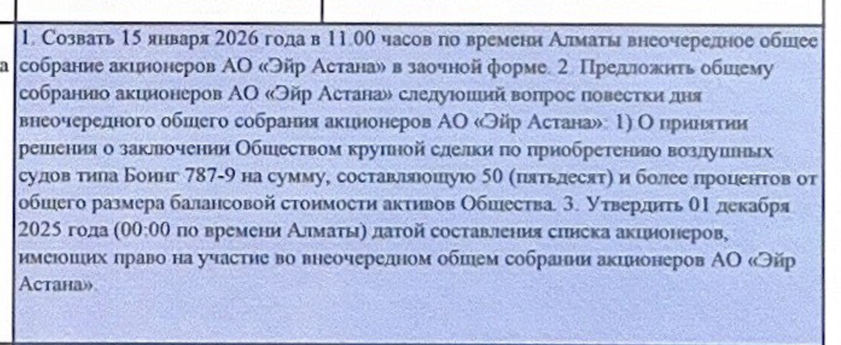 The company has scheduled a shareholder meeting for January 15 in Almaty, with a single agenda item: approval of a transaction to acquire Boeing 787-9 aircraft.