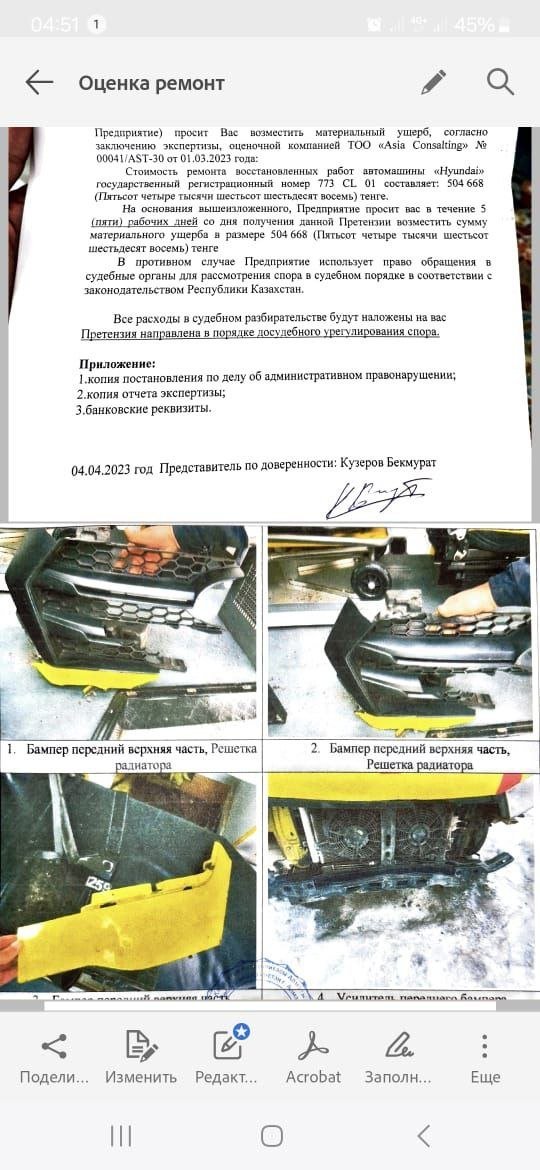 When I was told to pay for repairs, I found spare parts — a bumper, a grille, and a bumper cover — for 214,000 tenge. I brought them to the station and asked to have them installed. However, the mechanics refused, stating that everything had to go through an appraisal company, as it should. I quickly realized that the amount would be inflated.