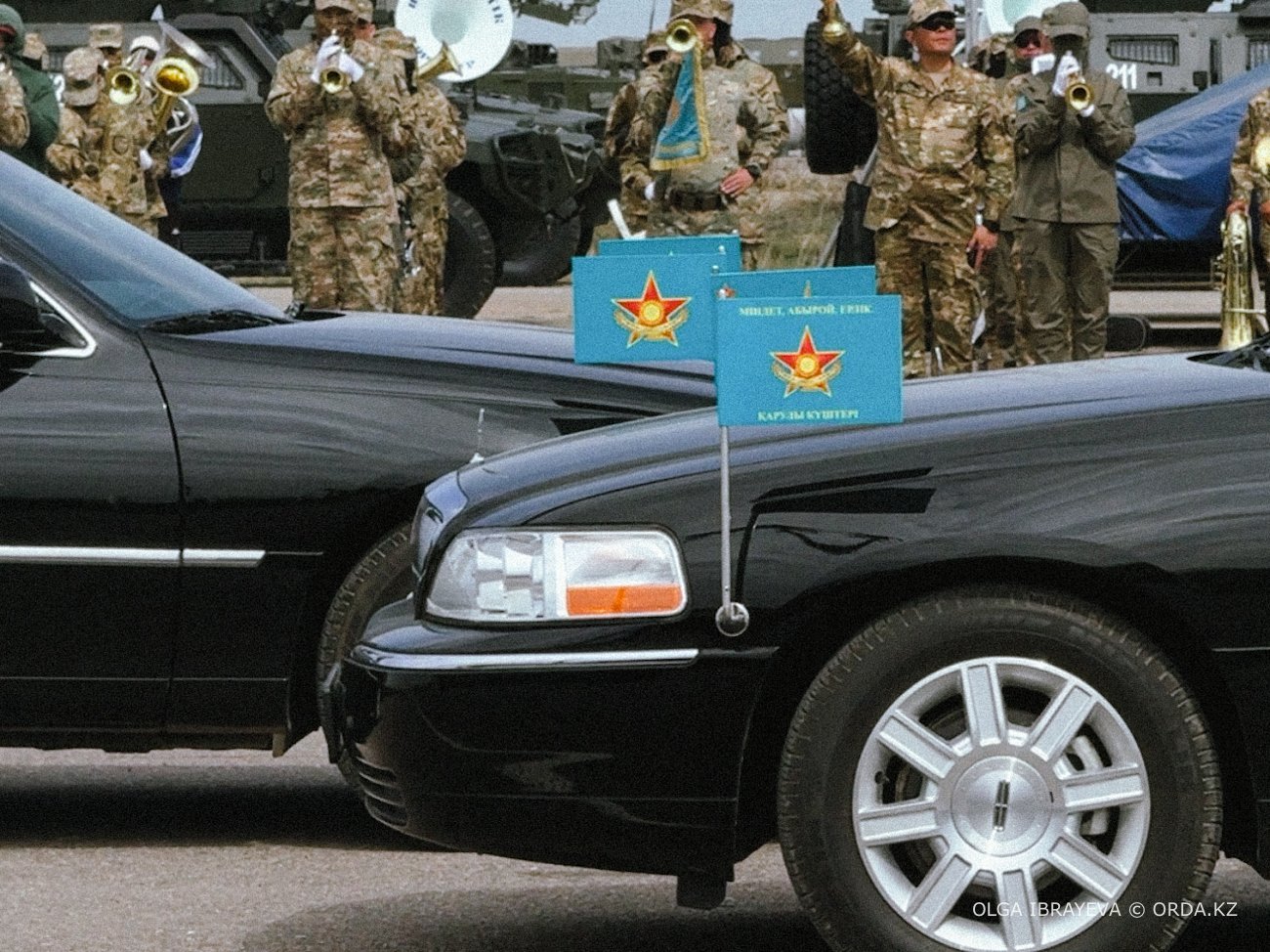 These are two black Lincoln Town Car convertibles used exclusively for military parades. On May 7, Defense Minister Ruslan Jaqsylyqov will ride one of the cars, inspecting the formation before joining the President to receive the parade officially.