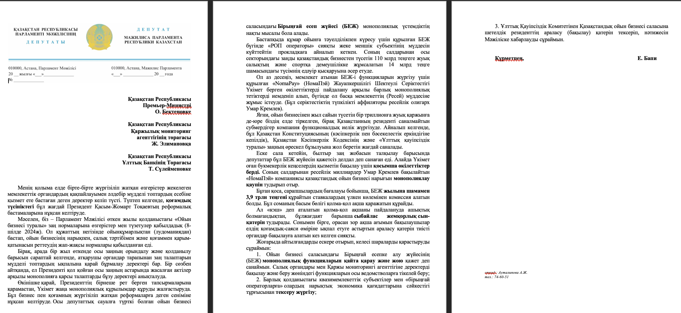 Majilis deputy Yermurat Bapi has sent an inquiry to Prime Minister Olzhas Bektenov, FMA head Zhanat Yelimanov, and National Bank chairman Timur Suleimenov, calling on them to review the role of the Unified Accounting System (UAS) in the gambling sector.