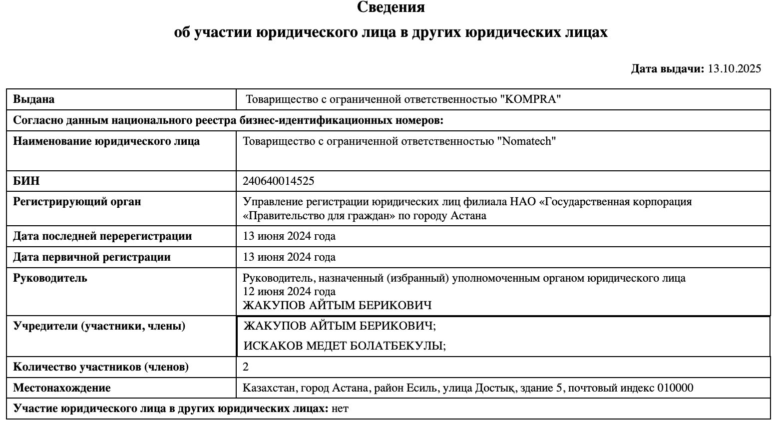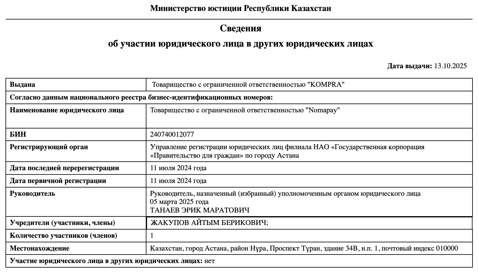 Nomapay LLP is a relatively new business entity. Officially, it provides “other auxiliary activities in the field of financial services, excluding insurance and pension funding.” It was founded in July 2024 by a single shareholder, Aitym Zhakupov, and is currently headed by Yerik Tanayev.