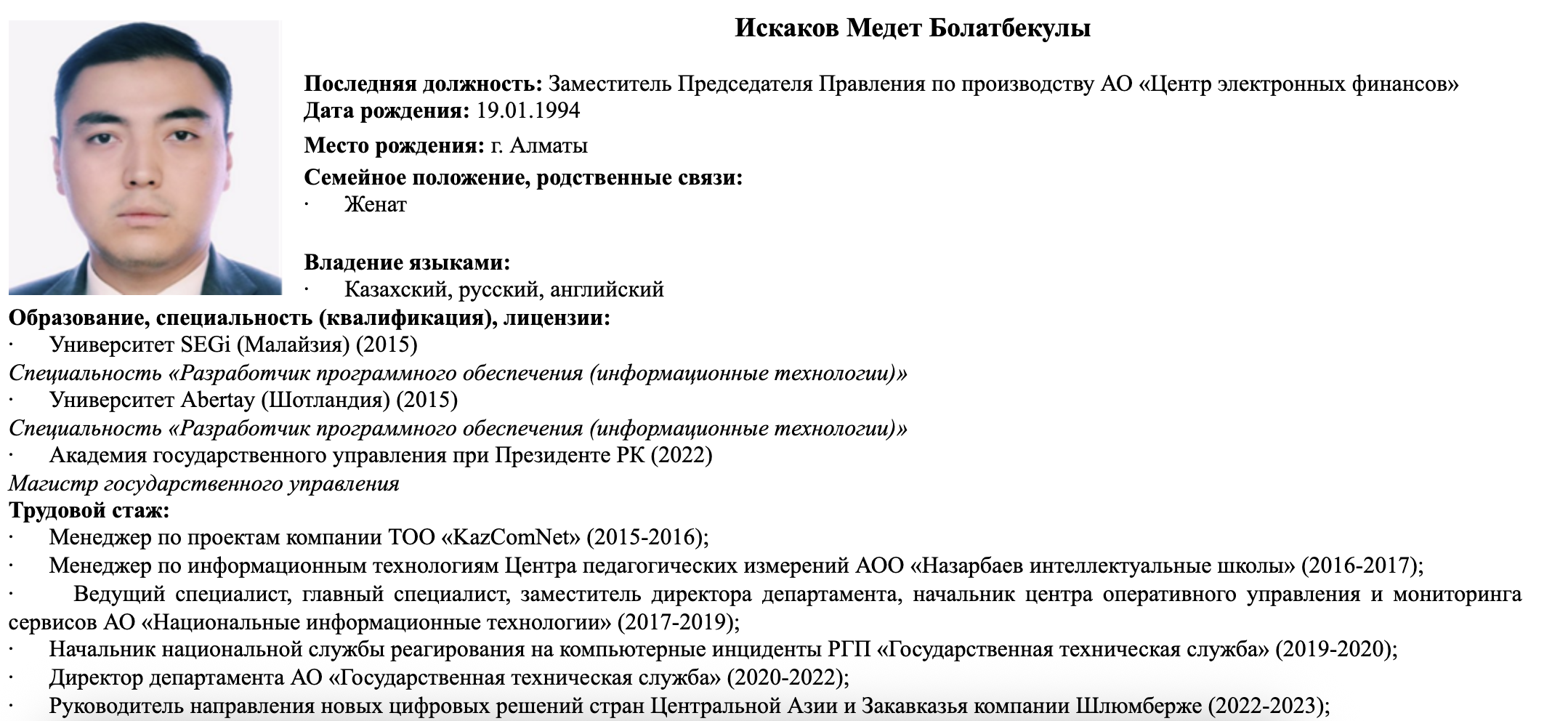 Co-founder Medet Iskakov is an IT professional. According to online.zakon.kz, he previously served as Deputy Chair for Production at the E-finance Center JSC — a state-owned structure fully controlled by the Ministry of Finance, established by the same Committee for State Property and Privatization that owns the UAS.