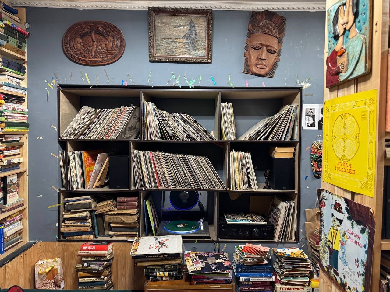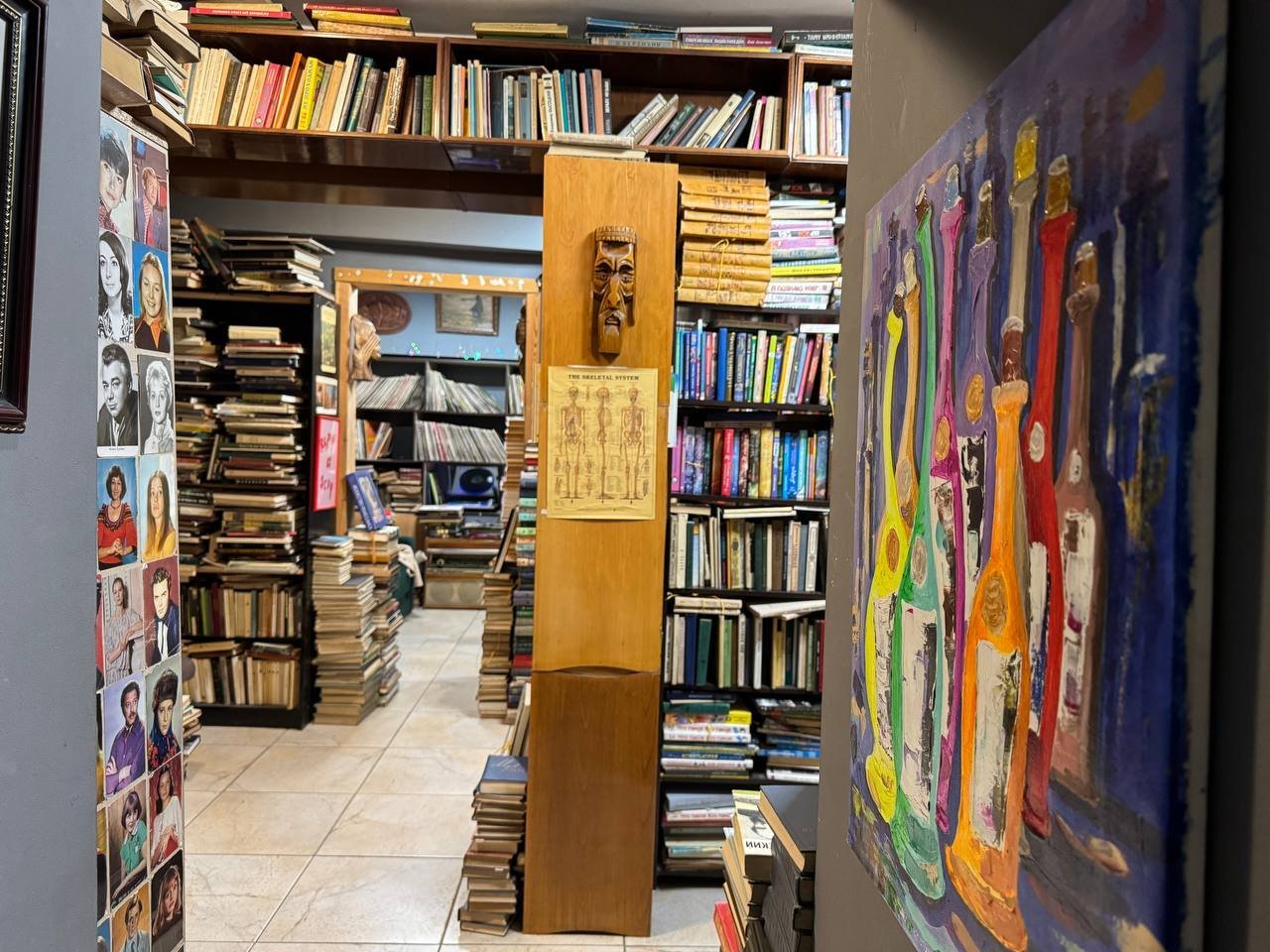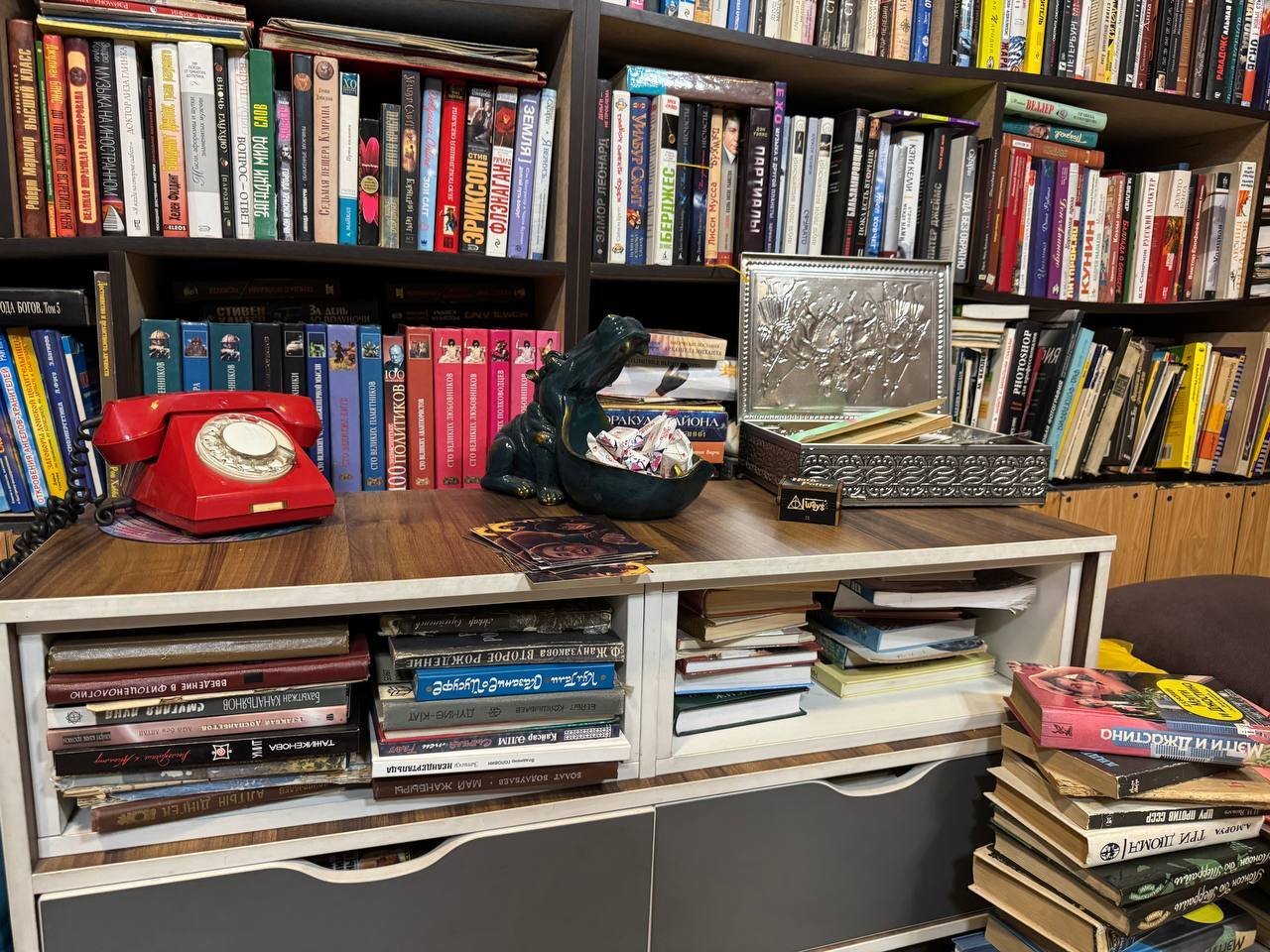 The narrow aisles are lined with shelves sagging under the weight of books. In one corner, a record player softly spins vintage vinyl, adding to the cozy, nostalgic vibe. The walls are adorned with paintings, clay panels, and photos from all over the world. One standout piece is an old red rotary phone from Tbilisi — a small yet powerful link to the past.