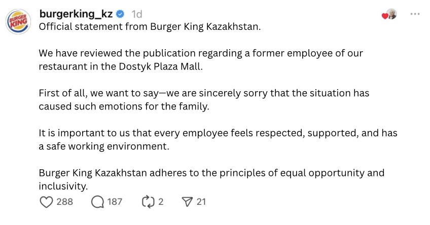 Burger King responded fairly generally, expressing regret about what happened and stating that the company supports equal opportunities for all employees in its network. The Ministry of Labour also responded to the public outcry, stating that it would look into the situation and conduct an inspection of the food service chain.