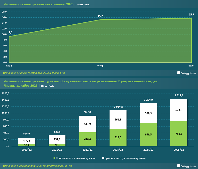 Russia remains the leading source of tourists visiting Kazakhstan. In 2025, 429,800 people arrived from Russia, 7.2% more than a year earlier. China ranked second, with 241,700 visitors, posting a much stronger annual increase of 38.9%.