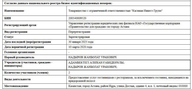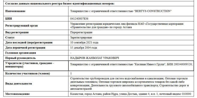 A review of the company’s background revealed that Bertys Construction is registered as a high-risk taxpayer. The firm, established on December 15, 2004, in Astana, is owned by Caspian Invest Group, whose founder is Zhanbolat Nadyrov.