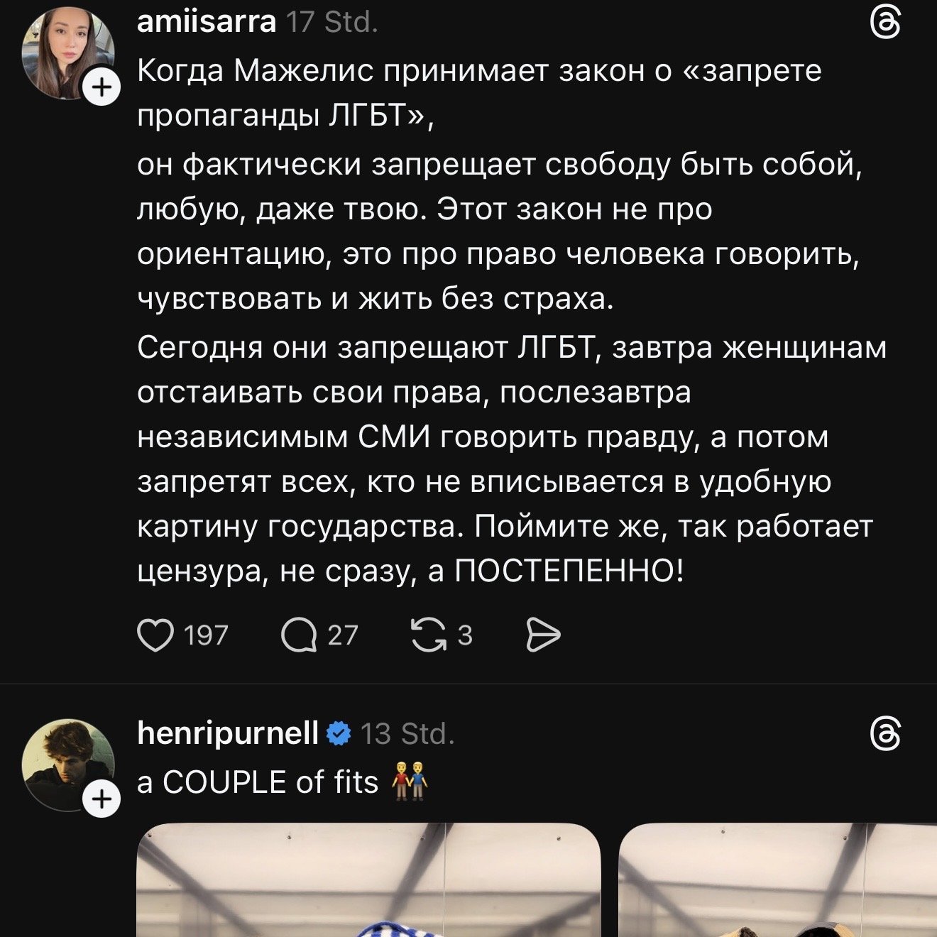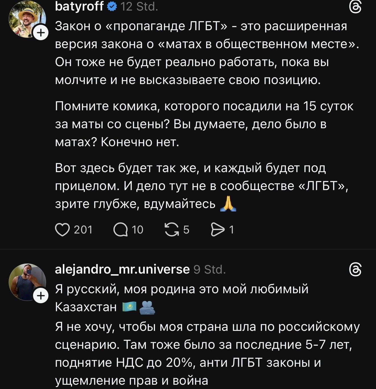 When the Majilis passes this law, it effectively bans the freedom to be yourself — any kind of person, even your own. This law isn't about sexual orientation; it's about a person's right to speak, feel, and live without fear. Today they ban LGBT people, tomorrow they ban women from defending their rights, the day after tomorrow they ban independent media from telling the truth, and then they'll ban anyone who doesn't fit into the state's convenient picture.