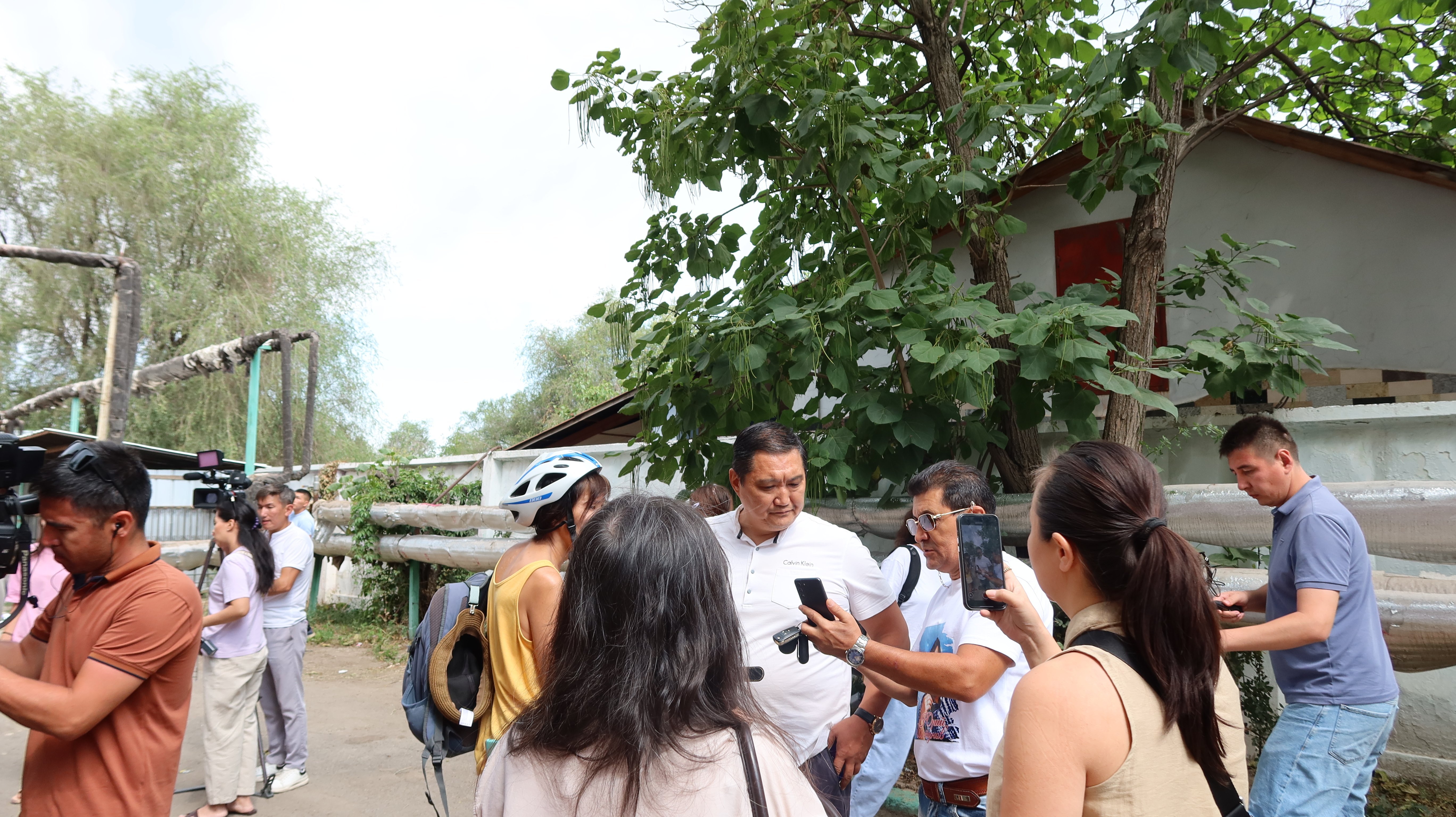 The dynamic shifted when Majilis Deputy Bakhytzhan Bazarbek arrived at the scene. Walking briskly toward the director, trailed by a crowd of reporters, he immediately began pressing for answers.
