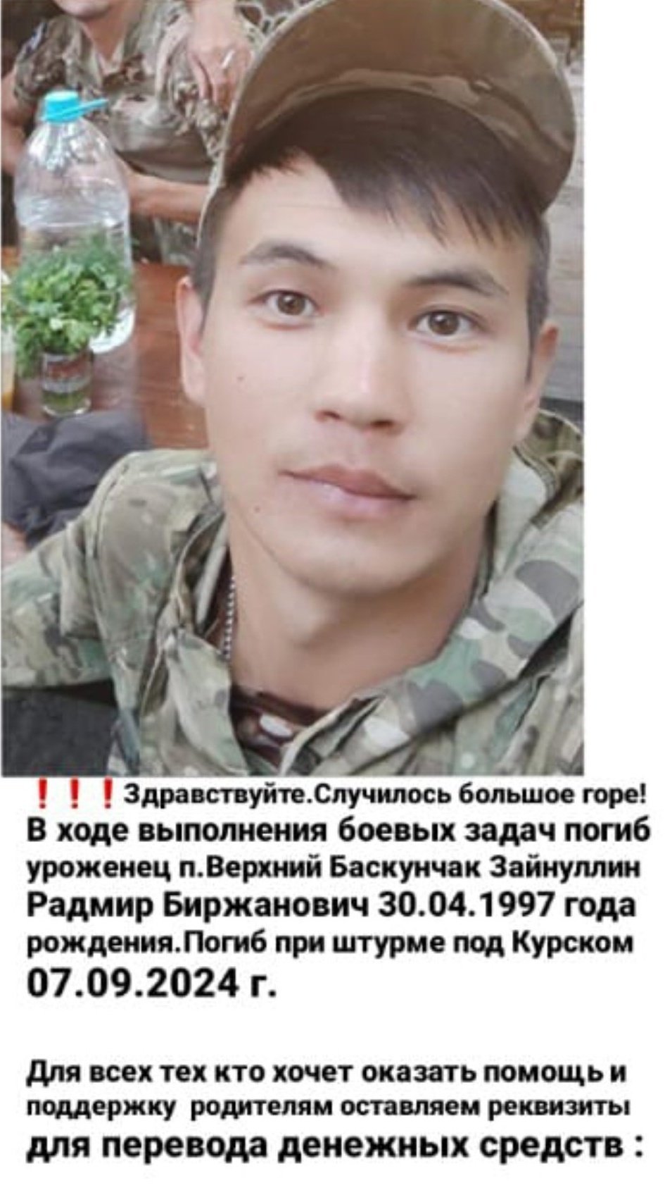 There is very little information regarding casualties among ethnic Kazakhs. In the group “Association of Kazakhs of Astrakhan," there is a post from September 14 dedicated to 27-year-old Radmir Zainullin. He died on September 7 in the Kursk region.