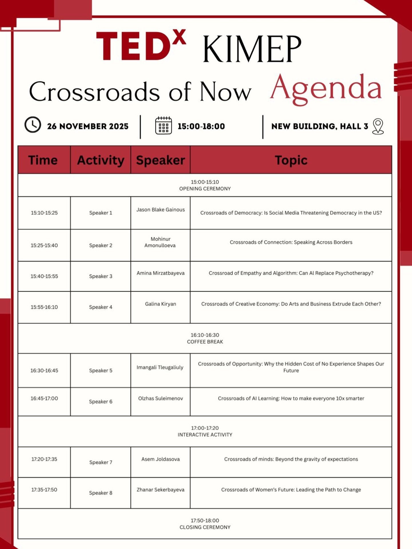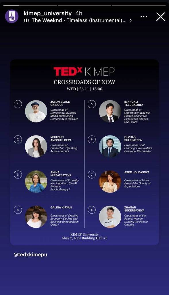 Sekerbayeva was expected to speak on November 26 at 17:35, presenting “Women at the Crossroads of the Future: Leading the Way for Change.” Instead, she was informed by the TEDxKIMEP president shortly before the event that her talk had been removed from the program.