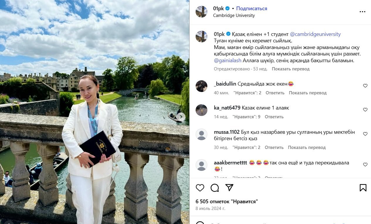 From the Kazakh people — one more student of Cambridge University. This is the best birthday present. Mom, thank you for giving me life and the opportunity to study in these walls.