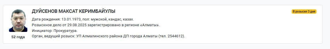 Former Chief Transport Prosecutor of Kazakhstan, Maksat Duissenov, has been wanted for three days. The information appeared in the legal statistics database, reports Orda.kz.