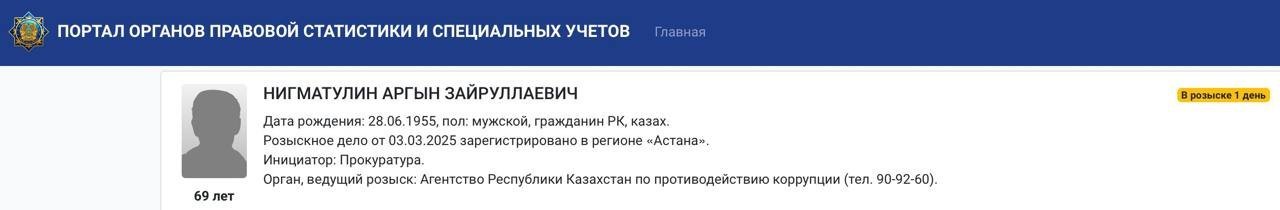 As part of the pre-trial investigation, A.Z. Nigmatulin was recognized as a suspect, with the court's sanction, a preventive measure in the form of detention was chosen against him, and due to his location outside the Republic of Kazakhstan, he was declared wanted, The Prosecutor General's Office said.