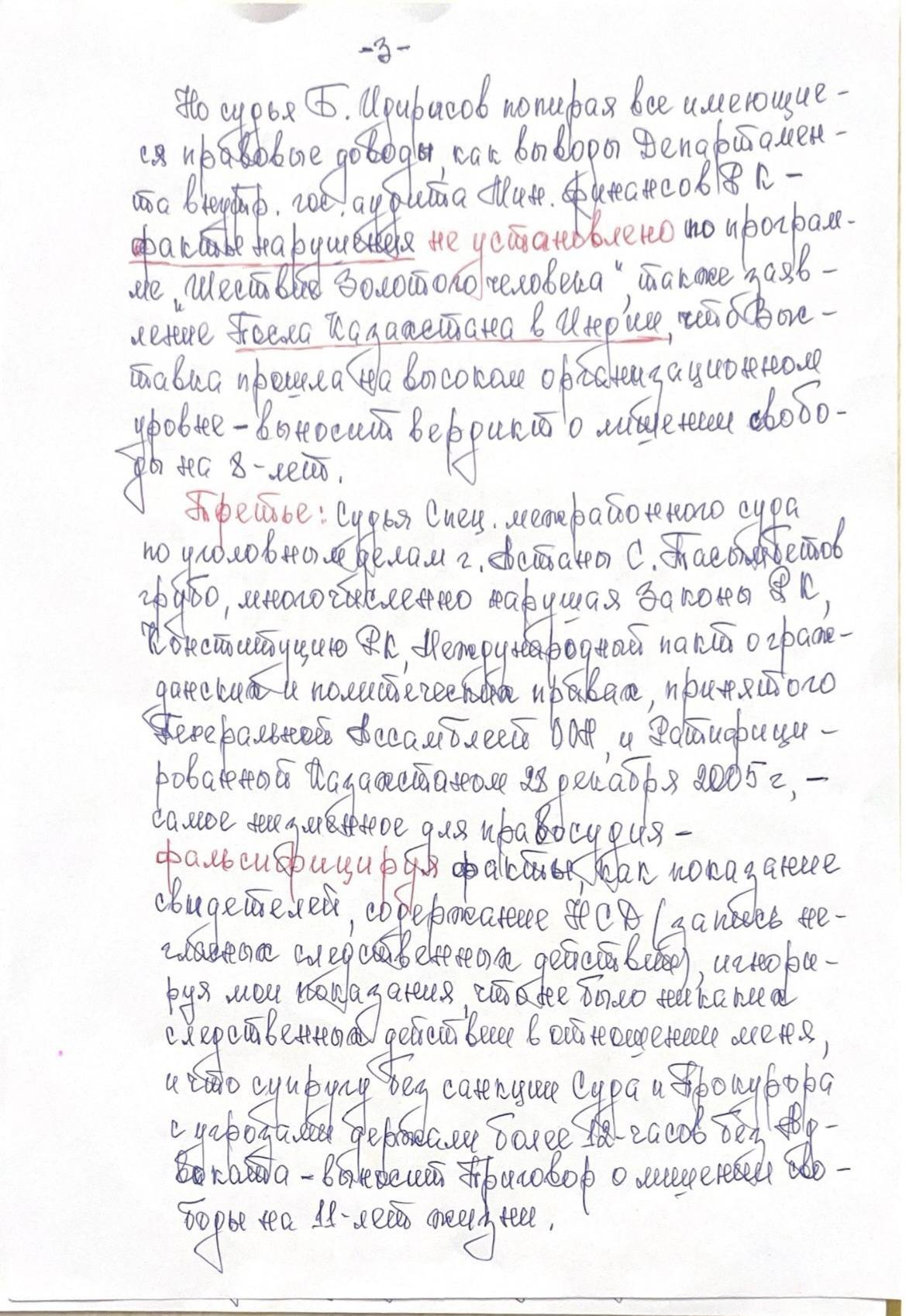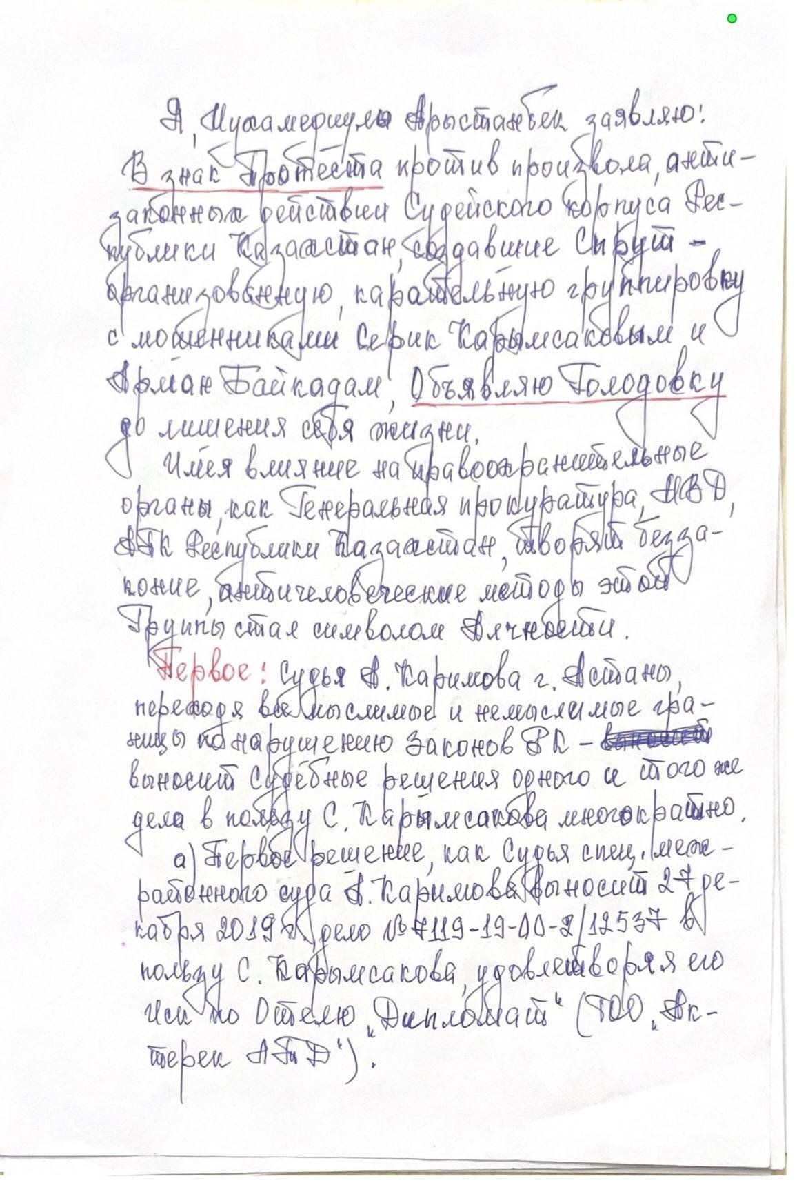 I, Mukhamediuly Arystanbek, declare: in protest against the arbitrariness and illegal actions of the judiciary, I declare a hunger strike until I take my own life, the message says.