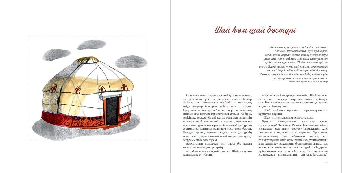 How is tea prepared and served in different parts of the country? Where is it poured in just a few sips, and where is a full bowl customary? What’s added to tea — and what is served with tea? The book also explores the evolution of these traditions and the enduring spirit of Kazakh hospitality. It includes interesting stories from our contemporaries and a brief excursion into history...the annotation reads.