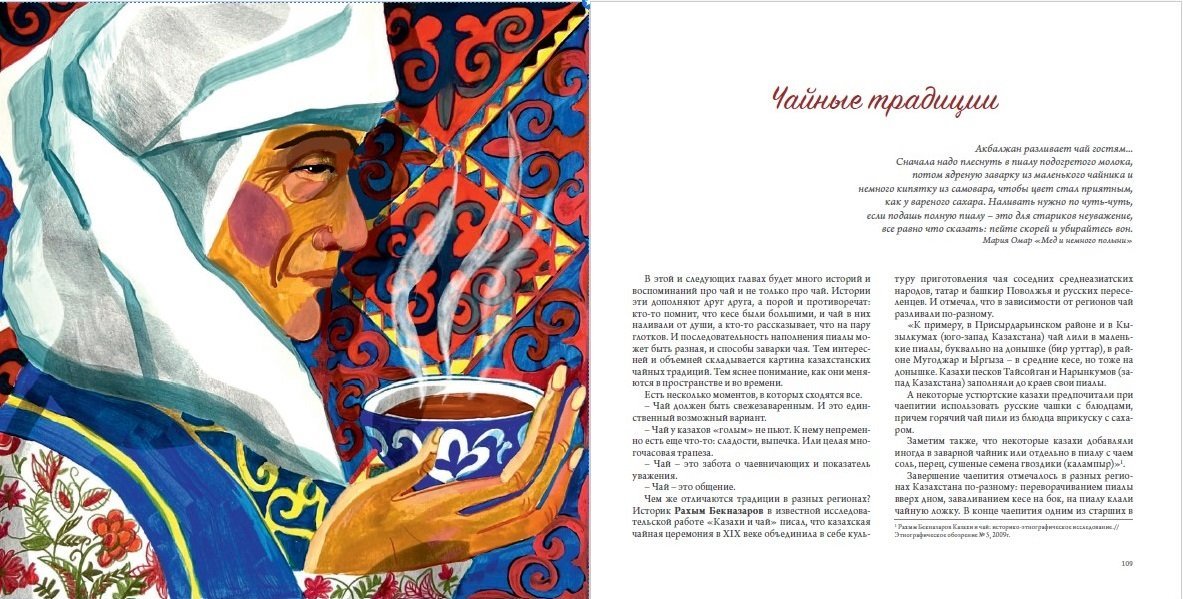 Writer Svetlana Poznyakova and artist Alexandra Wirch began working on the project over three years ago. Their research involved digging through electronic archives, libraries, historical records, and anthropological studies, as well as conducting interviews and surveys with Kazakhs from various regions. They discovered that no similarly comprehensive book on tea had ever been published in Kazakhstan.