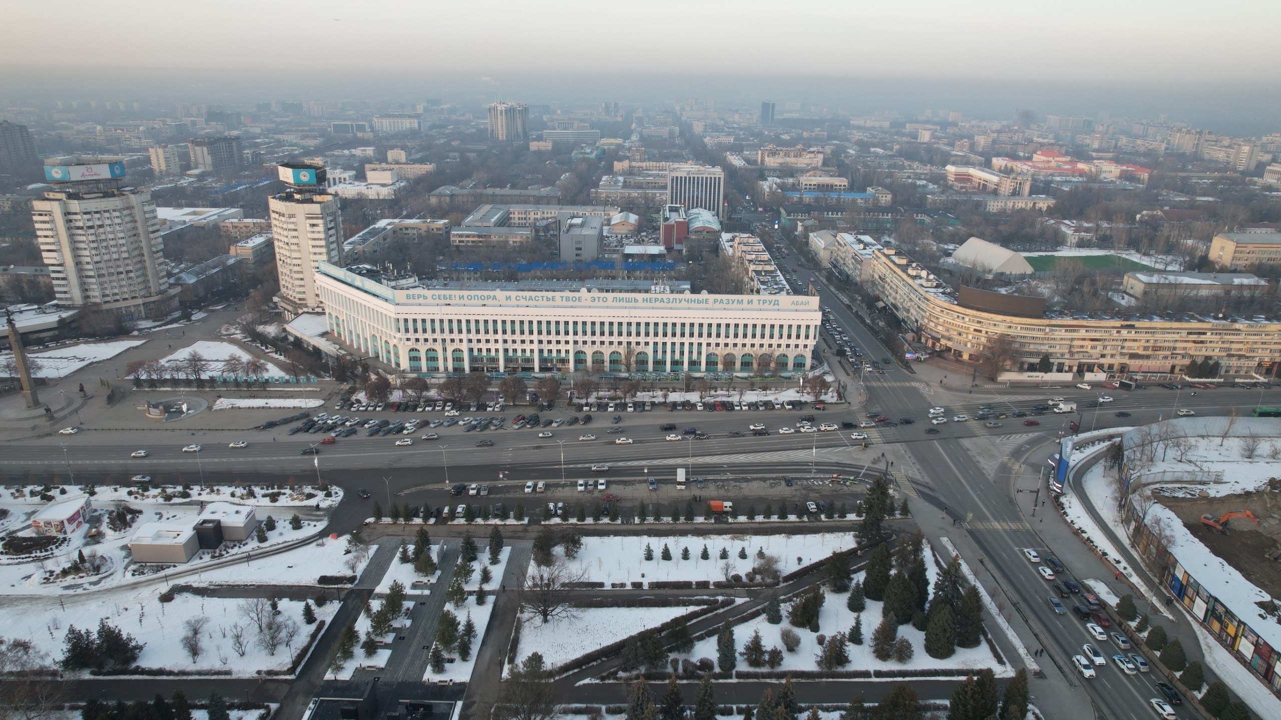 The neighboring building on the corner of Satbayev and Jelktoqsan Streets also suffered during Qantar but to a lesser extent.