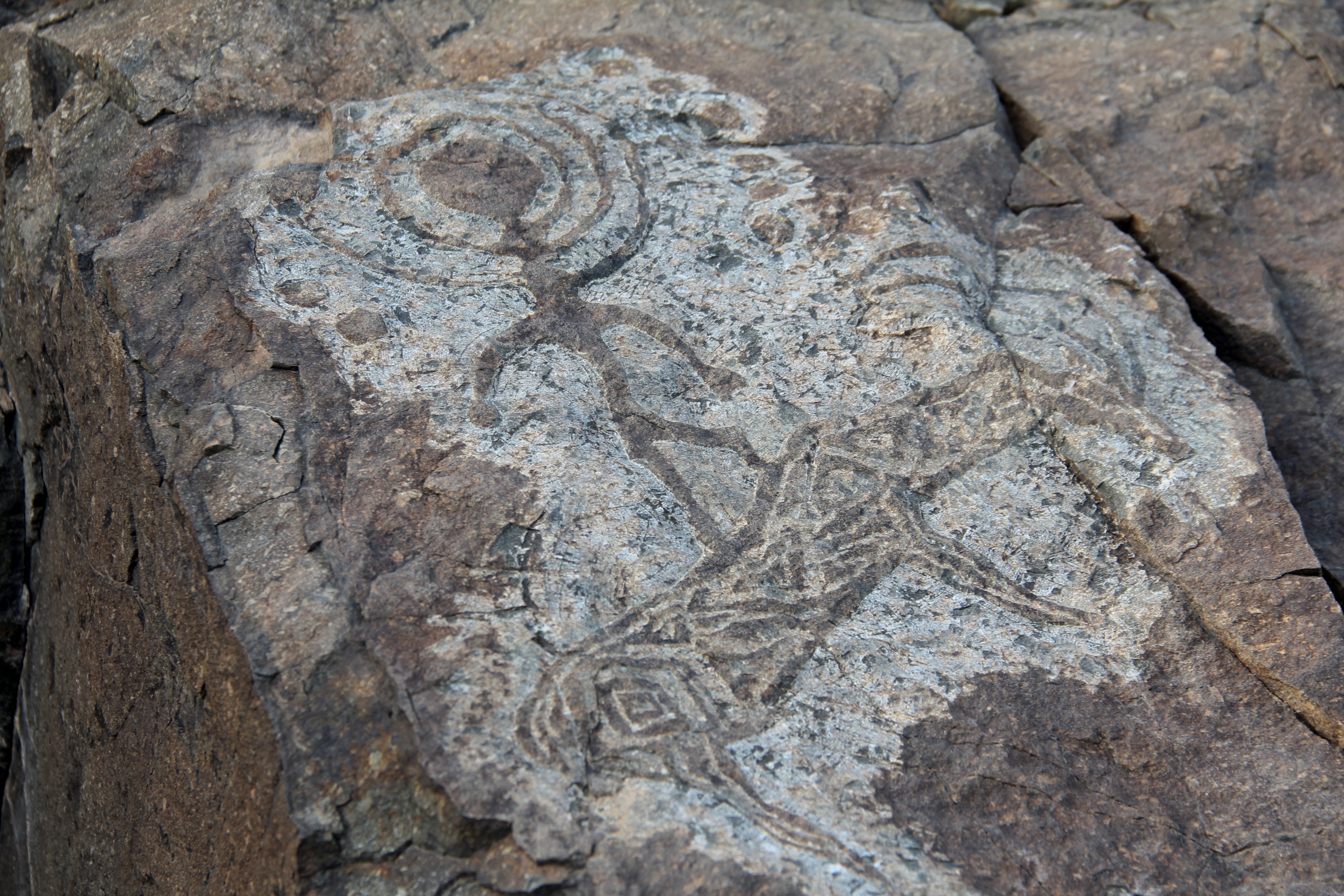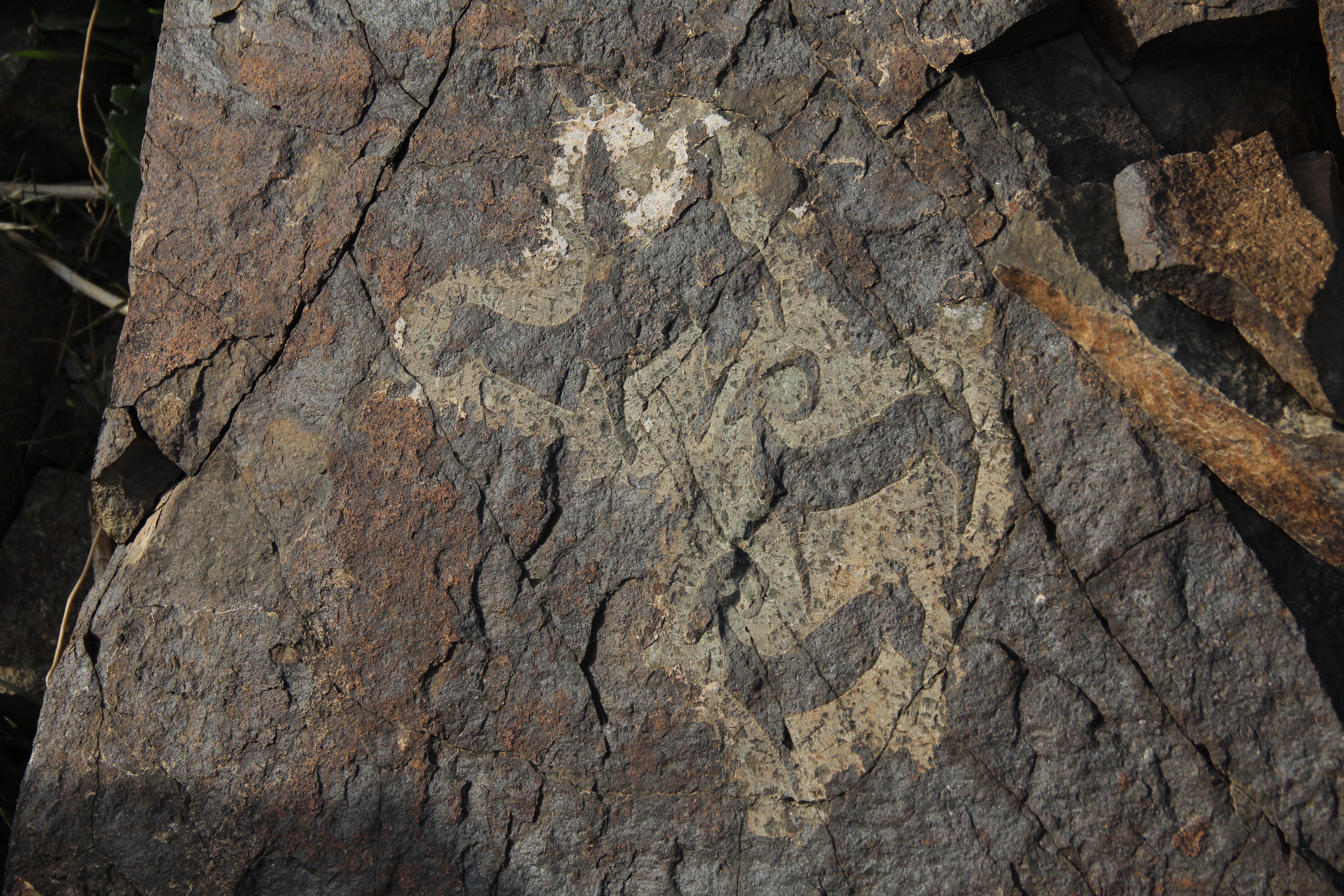 I came across this exact spot last year and immediately realised the rocks here were perfect for petroglyphs — but there were no carvings. More precisely, almost none. Just four petroglyphs nearby, and those were of teke — mountain goats, the artist recalls
