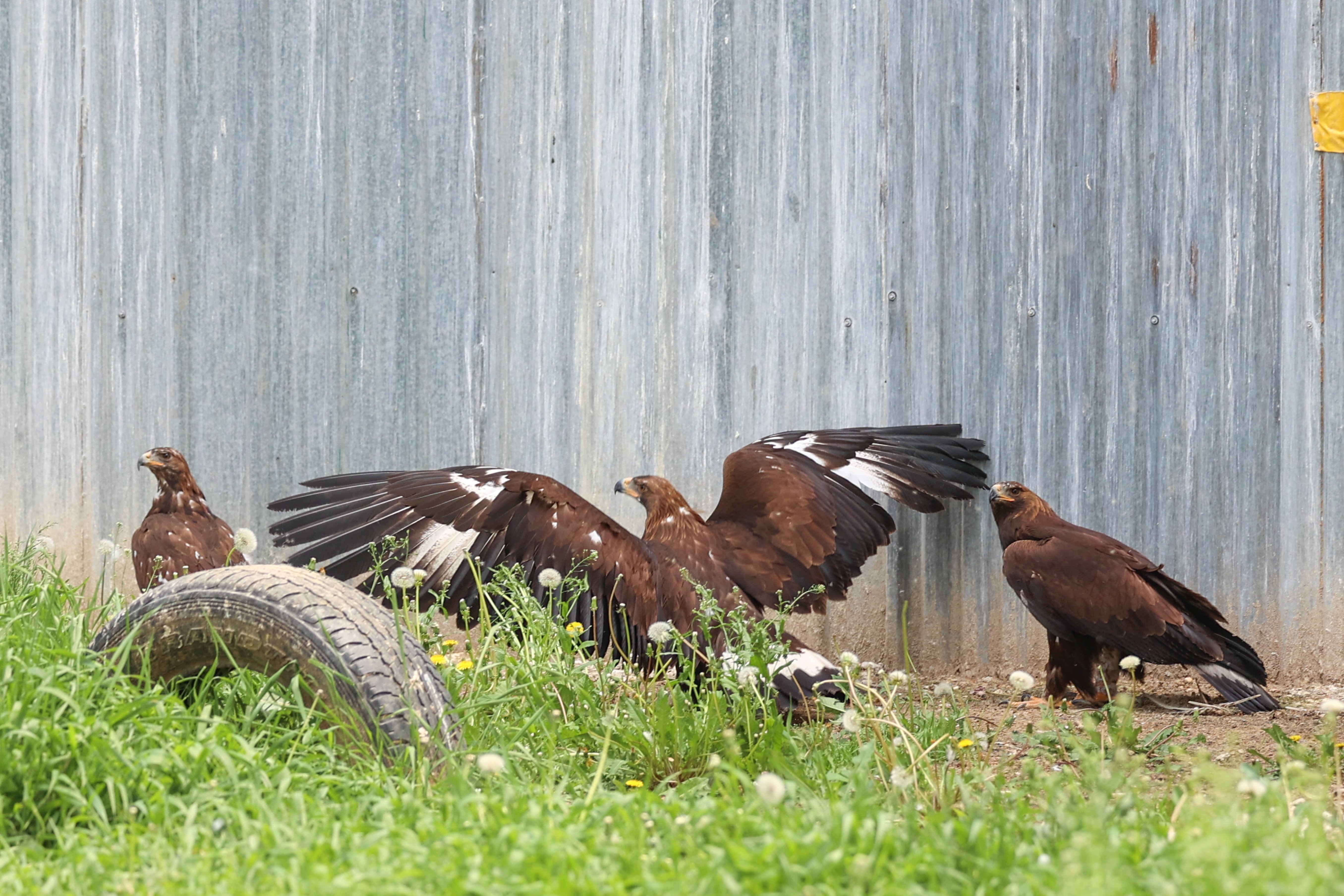 The enclosure is spacious, with a cylindrical metal structure topped with netting, grass flooring, and enough room for several young birds to fly and practice hunting without restriction.