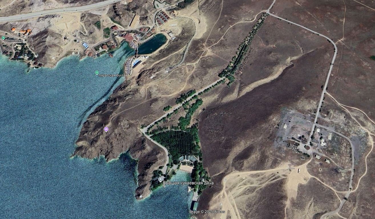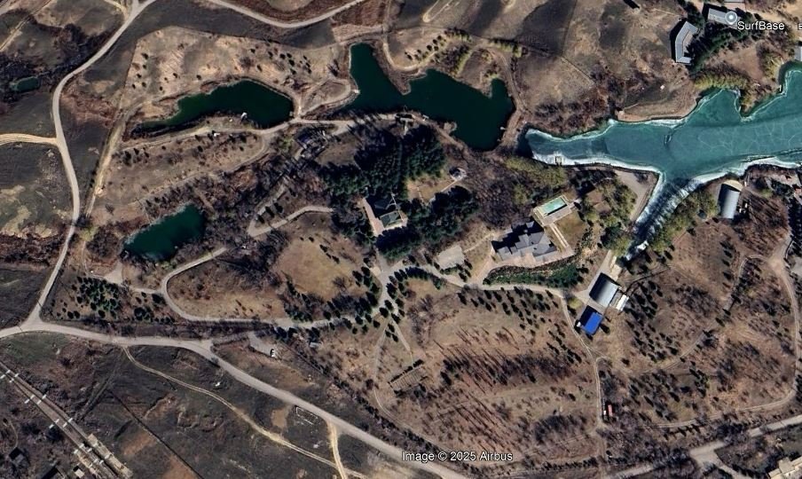 Unlike Abykayev’s property, satellite images show developed infrastructure: houses, outbuildings, piers, ponds, and a swimming pool.