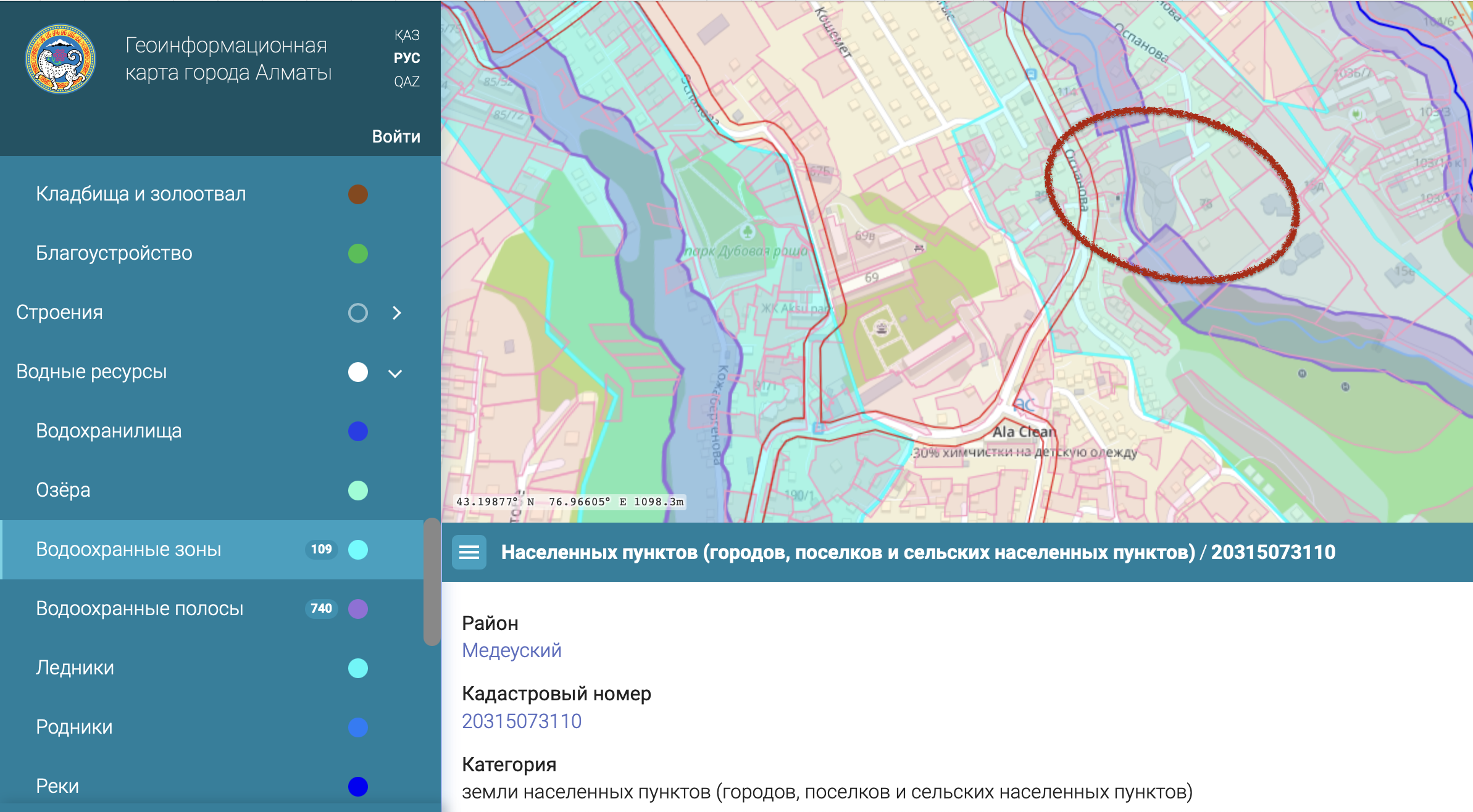 According to Almaty’s geoinformation map, the hotel does indeed sit in or near a water protection zone.