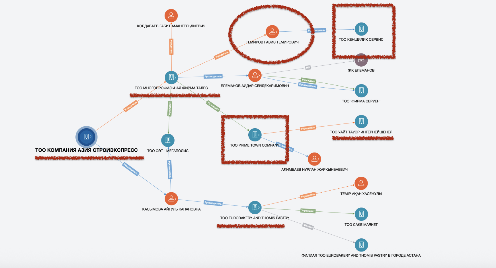 Before that, the founders were Gaziz Temirov and Zholdasbay Amanzholov. Temirov heads KENSHILIK SERVICE LLP, which, after several intermediary steps, founded Asia Stroyexpress LLP. That company then provided a link to WHITE TOWER INTERNATIONAL LLP — also owned by the Kulmakhanov family.