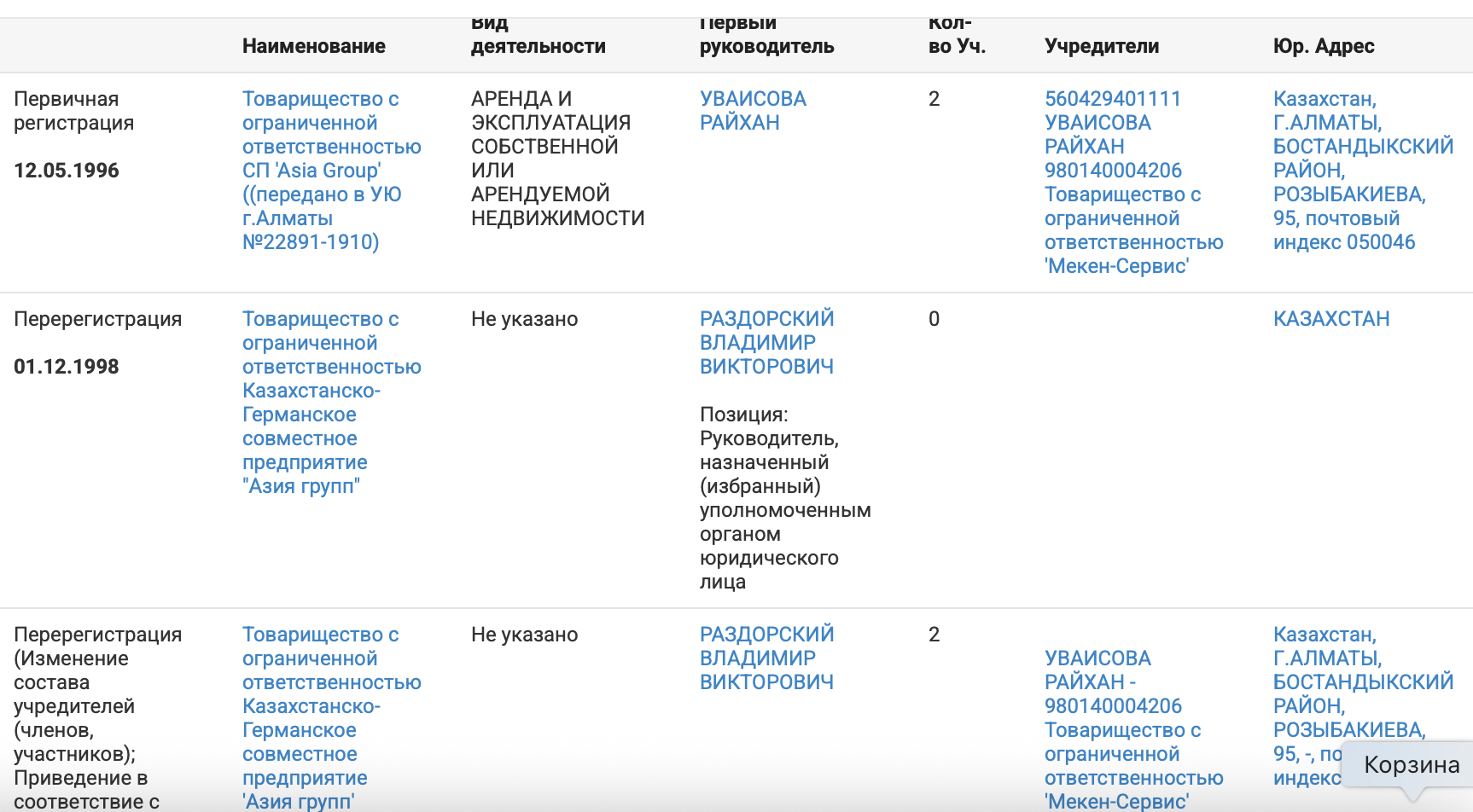 Meken-Service LLP, in turn, also has members of the former Akim’s family among its founders. They officially joined the company in 2010 through the Kazakhstan-German enterprise INTERFOOD LLP — another “Kazakh-German” link.