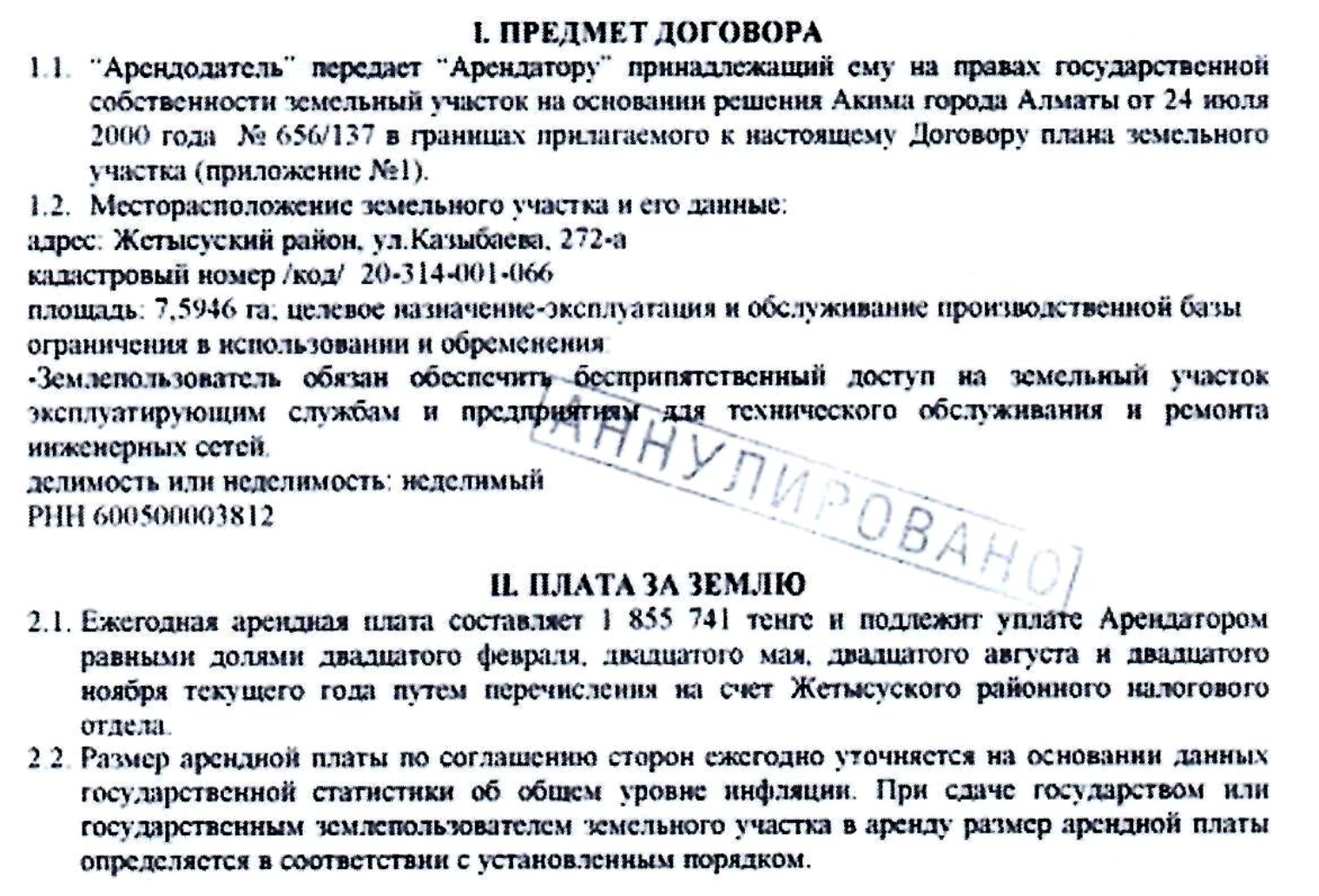 In 2000, Sert JSC leased this land from the Akimat for just 1.8 million tenge per year. The agreement lasted until September 2003, after which Yermegiyayev bought the production base.
