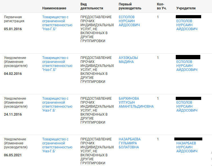 Together with Gulmira, Nursain co-founded “NAZ‑G.B” LLP in 2016. The management included the elusive Madina Auezkyzy, later replaced by Ultusyn Barkhinova, who, as Almaty-region election commission chair, barred journalist Duman Mukhammedkarim from running in parliamentary elections.