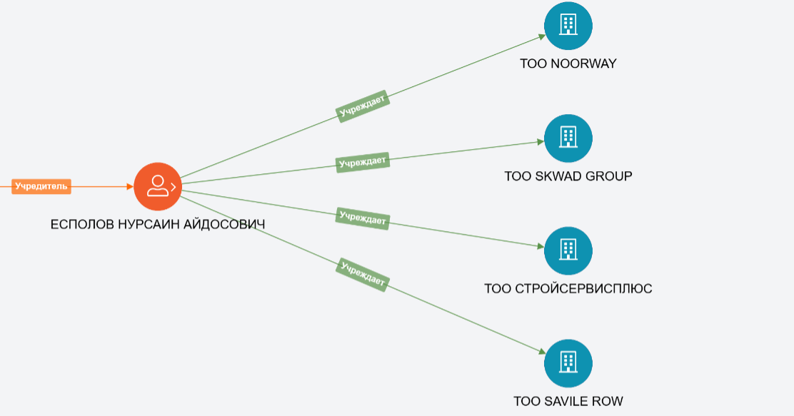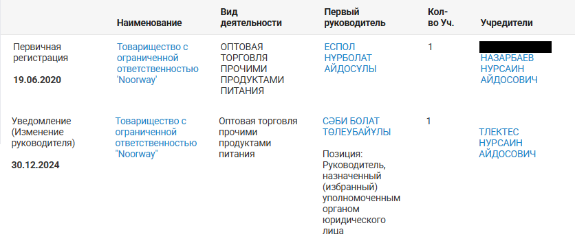 Another venture, Noorway, was registered in Almaty on June 19, 2020, to engage in food wholesale. The paperwork listed Nurbolat Aidosuly Yespol as the director and Nursain Aidosovich Tlektes as the founder.