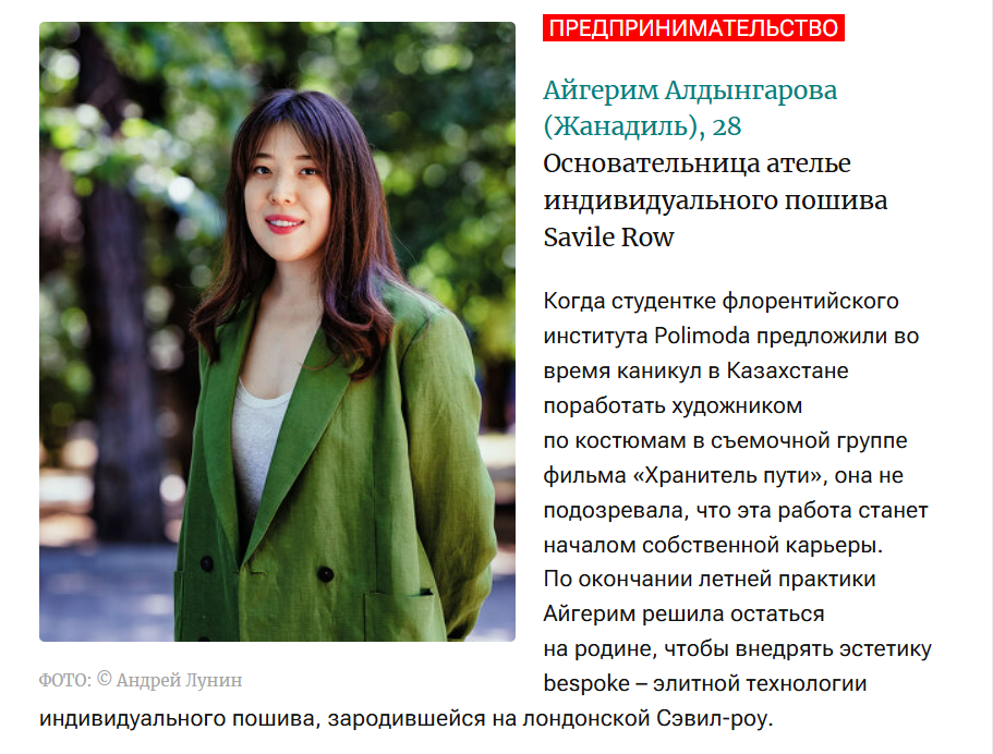 Aldyngarova, featured in Forbes Kazakhstan’s 2021 “30 Under 30: Leaders of the Future” list, told the outlet she studied at Florence’s Polimoda Institute and stumbled into fashion after working on a film set.