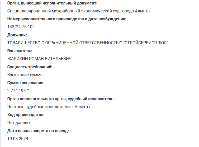 The firm is still active, although one of its managers is currently under a travel ban due to a lawsuit from businessman Roman Zharikhin, to whom the company owes over 2.7 million tenge.