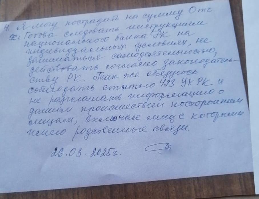 He asked if we had sold the apartment. I said yes, and that we had received the money. He said someone would be coming soon and that the money should be handed over through him. My husband was completely against it, but they insisted that they would provide documents from the National Bank and return the money later. They demanded that I persuade my husband. “Yerzhan” kept insisting: “You can’t keep that kind of money at home!”
