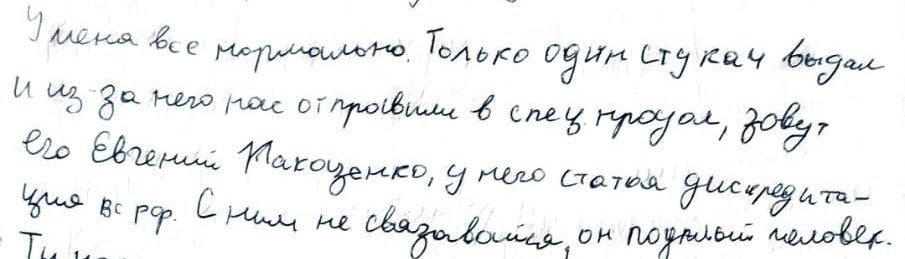 Everything is fine with me. Only one snitch gave us away, and because of him we were sent to the specialized prodol (specific section in the pretrial detention center - Ed.). His name is Yevgeny Nakaznenko. He has the article "discrediting" in the Russian Federation. Don't come into contact with him, he is a vile person.