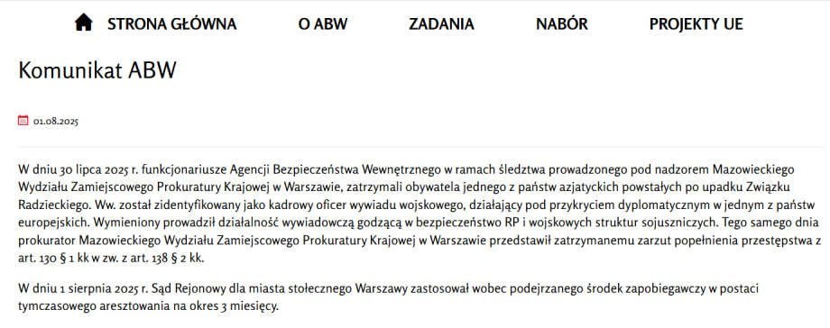 ABW said the suspect gathered information that posed a threat to Poland’s national security and the defense structures of allied countries. On August 1, 2025, the District Court of Warsaw ordered the suspect held in custody for three months.