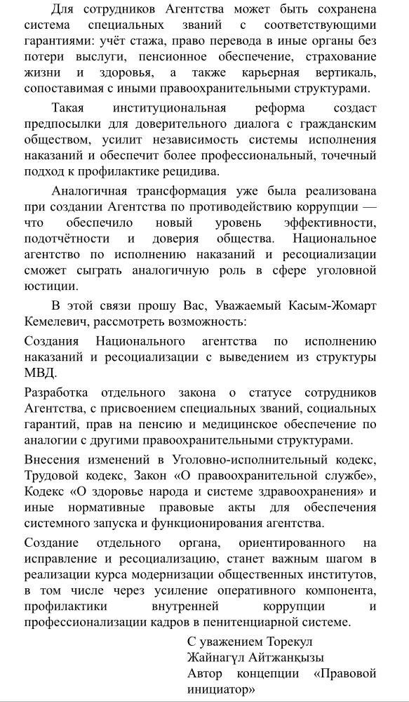 But understand this: if we don’t propose a new penal system model now, one oriented toward international standards and human-centeredness, it will be very difficult to achieve the president’s vision of a fair and safe Kazakhstan in the coming years. Funding the old model is just patching holes — not solving the problem. The new agency should have its own budget, independent from other ministries. Direct funding will allow flexible distribution of funds for penitentiary needs and resocialization programs.