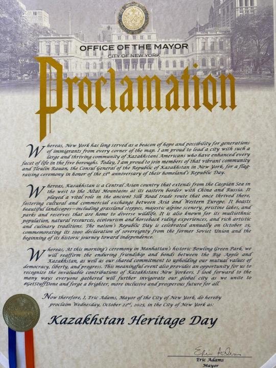 The act became a sign of respect for Kazakhstan and recognition of the Kazakh community's contribution to the city's cultural and social development. The proclamation reflects New York City's commitment to the principles of mutual respect and international partnership,