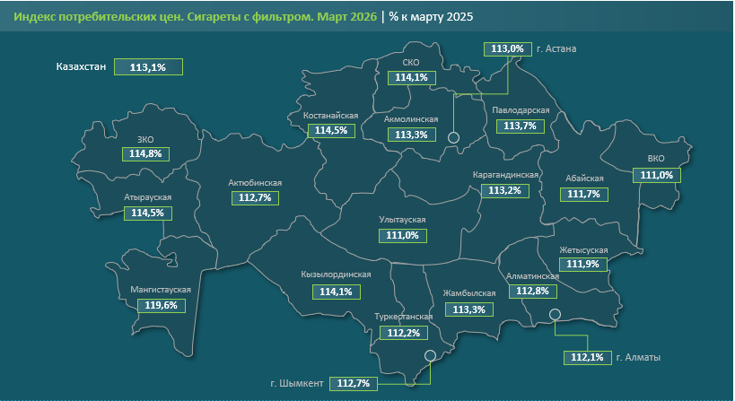 The sharpest price growth was recorded in the Mangistau region, where cigarettes rose by 19.6%. Other regions with notable increases included West Kazakhstan at 14.8%, and Atyrau and Kostanay regions at 14.5% each. The lowest growth was recorded in East Kazakhstan and Ulytau regions, at around 11%.