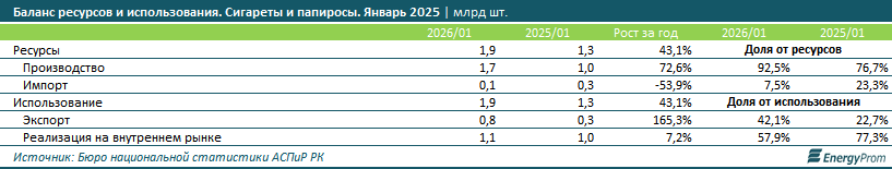 In January and February 2026, Kazakhstan produced four billion tobacco products, one and a half times more than in the same period a year earlier.