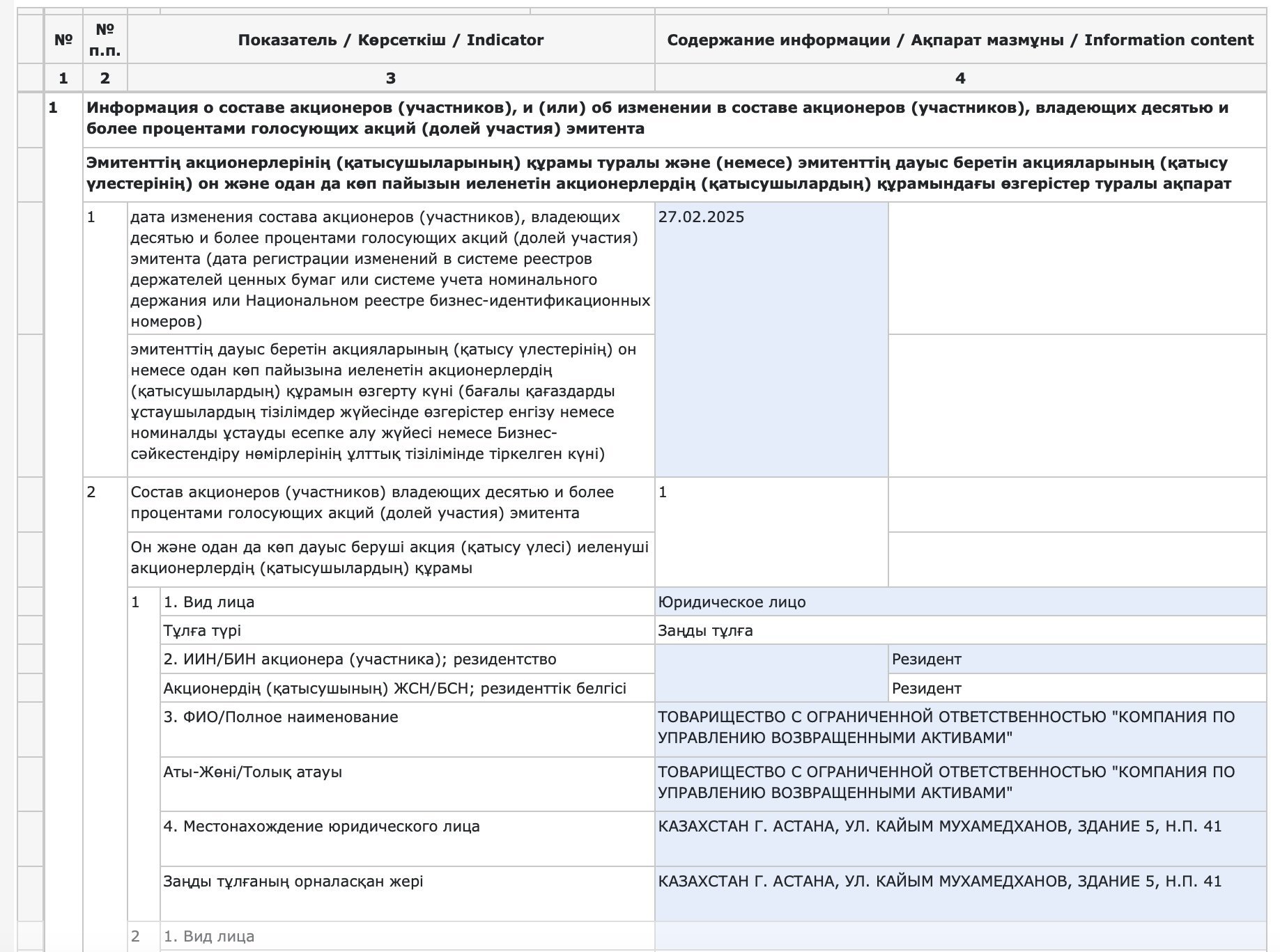 According to an extract from the Ministry of Finance’s financial statements depository, KBTU is now under the control of the State Company for the Management of Returned Assets.