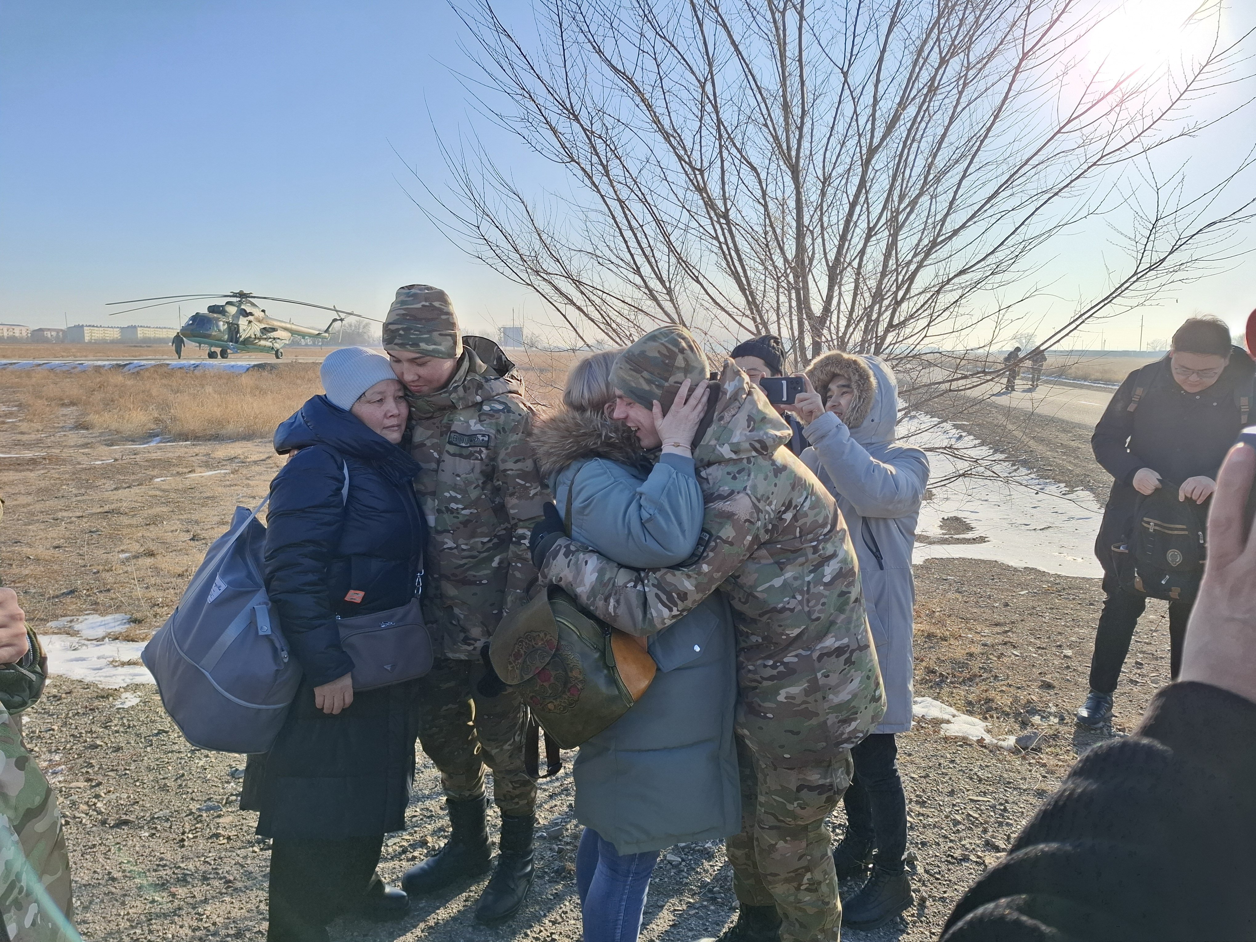 Boarding with engines running was an experience — the rotor blades whipped up powerful gusts of wind, and snow pelted exposed skin like needles. Everyone got an unintended "extreme rejuvenating peeling treatment" on their way to the Matybulak training ground in the Otar rural district.