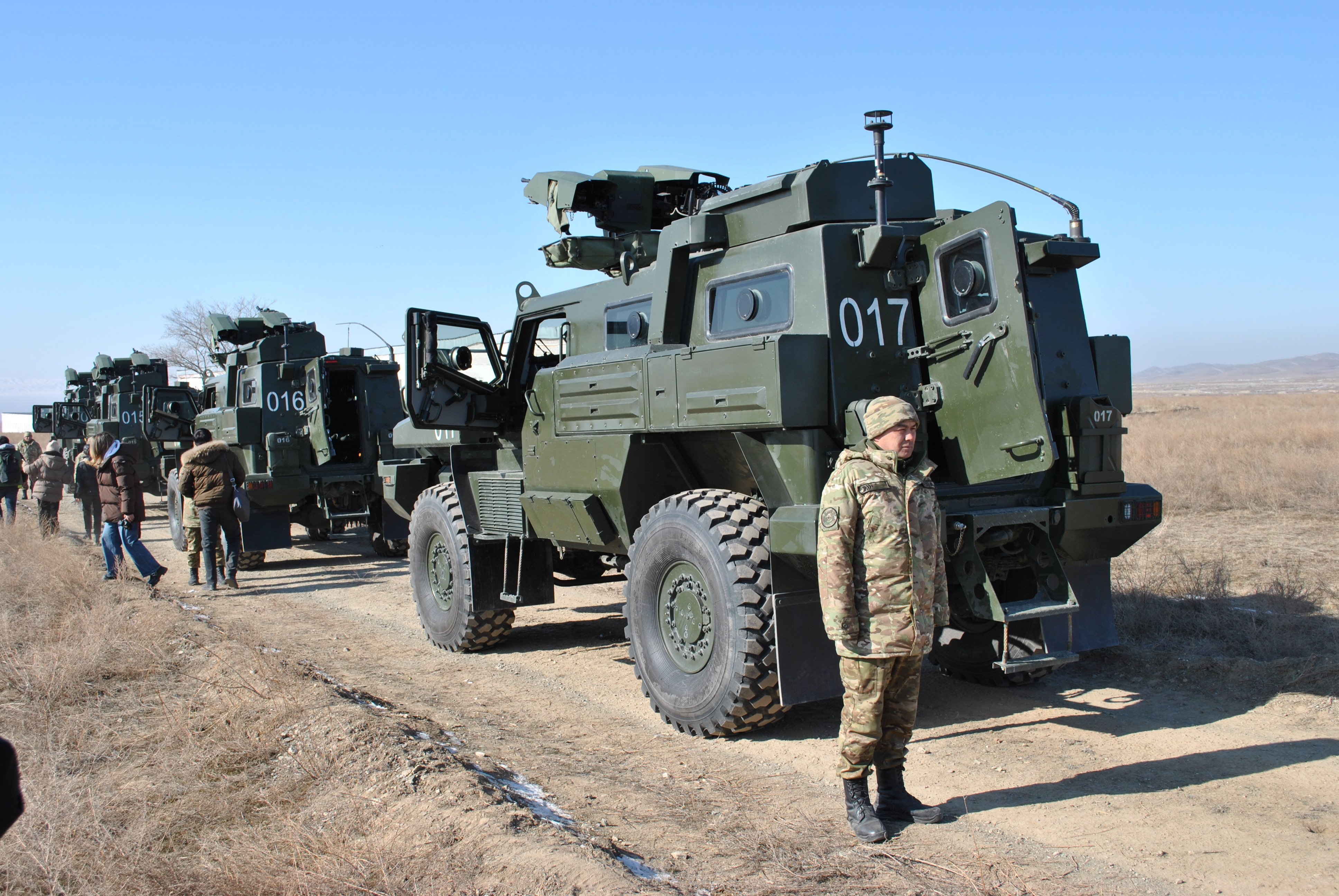 Journalists traveled between training stations in locally assembled Arlan armored wheeled vehicles (AWV). Designed to withstand explosions and gunfire, these vehicles feature a V-shaped hull to disperse blast waves and a fully sealed interior for protection against chemical attacks.