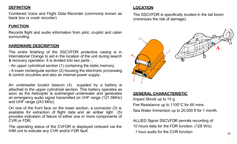 The EC-145 is equipped with the M’ARMS integrated recording and monitoring system, which includes a combined voice and flight data recorder (CVFDR) and UMS and HUMS technical monitoring modules — commonly called the “black box.”