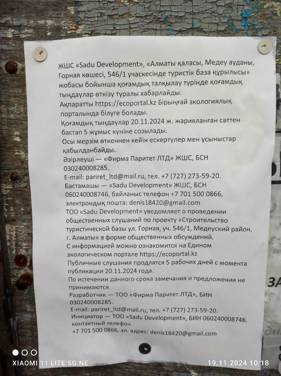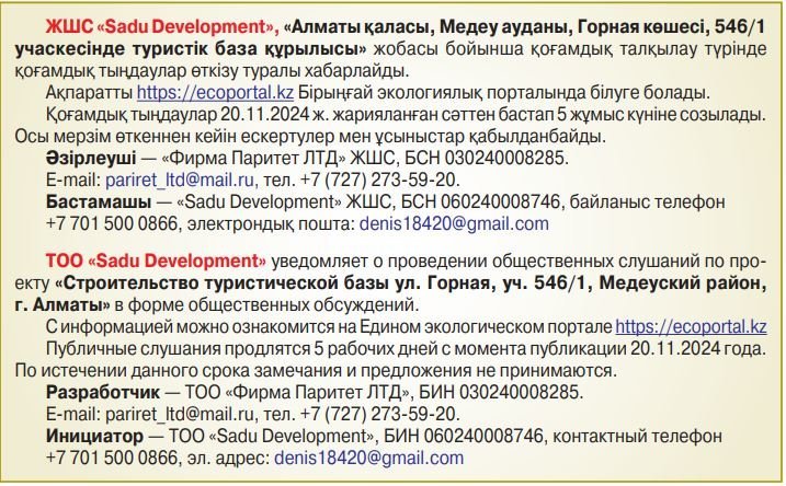 At the same time, the ecoportal.kz website reports that Sadu Development invited residents to participate in public hearings on the project. The announcement was published on the back page of the 45th issue of MK v Kazakhstane newspaper for 2024.