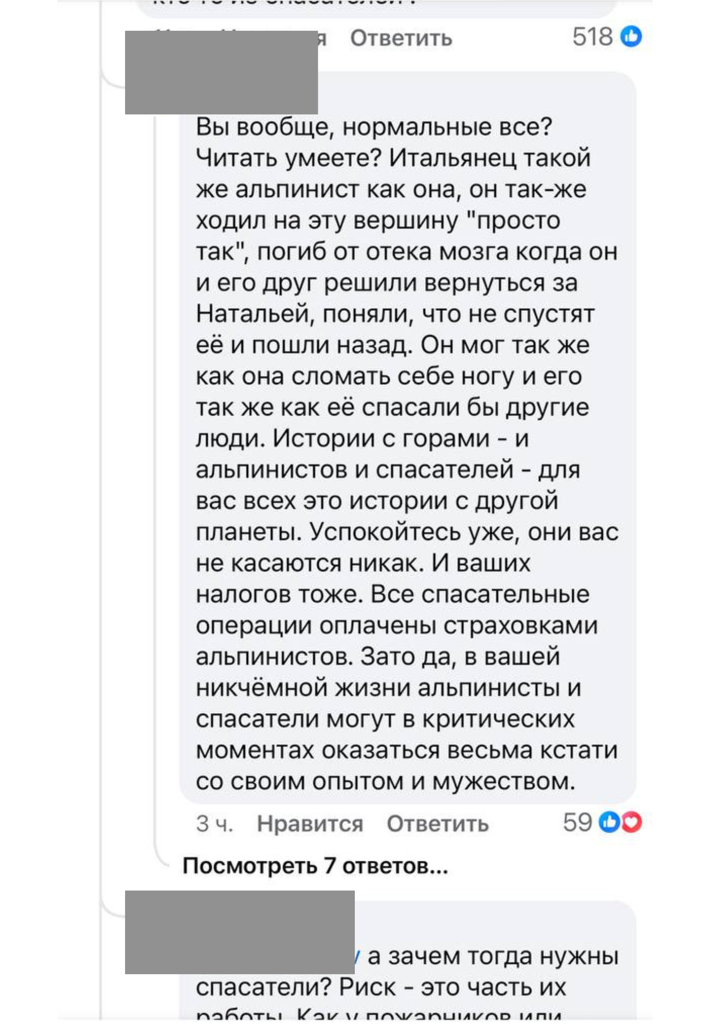 In the same place where Natalia is now, climber and master of sports Mikhail Ishutin died several years ago. On the descent from the summit, his heart stopped. His body has not yet been recovered.